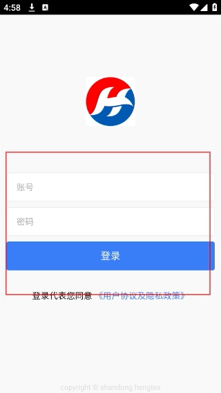 2、进入【恒泰办公】登录界面后,在【账号】和【密码】输入框中填写相应信息,点击【登录】按钮即可完成登录,登录操作视为同意相关协议。