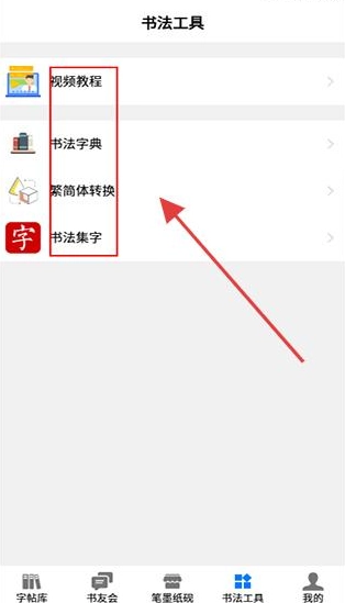 2、书法工具页面集成了视频教程、书法字典等功能模块,无论是学习笔法技巧、查询字体信息、进行繁简体转换,还是查找集字范例,都可以在这里高效实现。