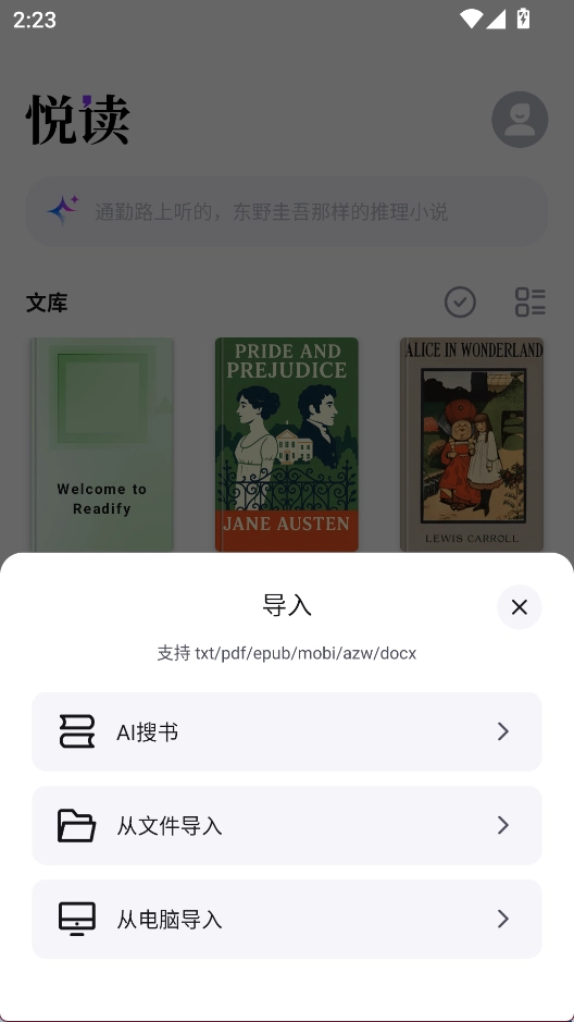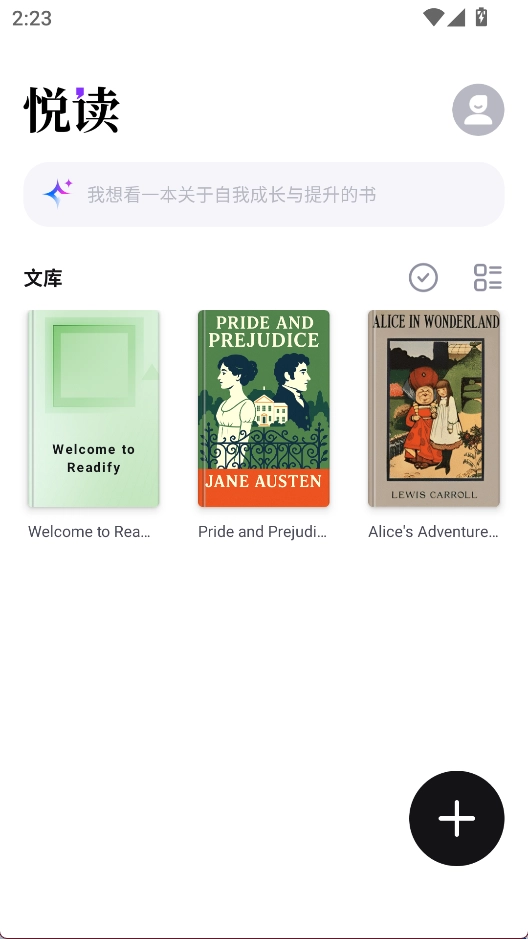 1、进入悦读后,可以点击+导入书籍