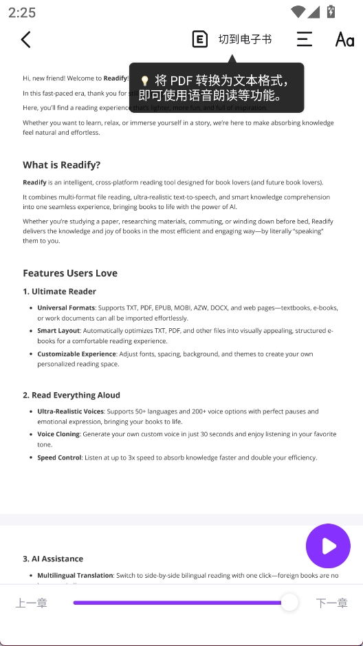 3、进入阅读界面后,只需一键即可转换为文本格式,随后就能使用语音朗读功能了