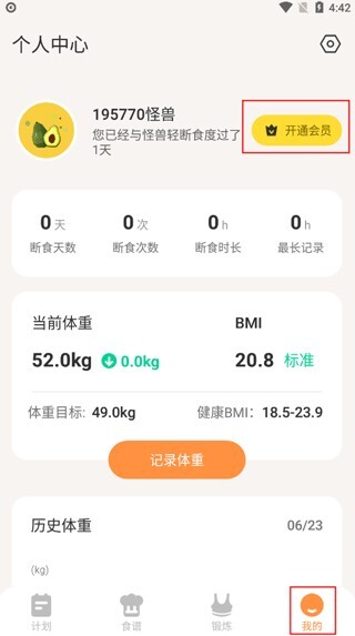 1、首先打开怪兽轻断食,点击我的,点击会员