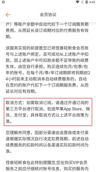 3、会员协议第三条收费和退费管理中有取消方式,我们只需要去开通订阅的第三方平台进行取消就行了,如微信、支付宝等平台。