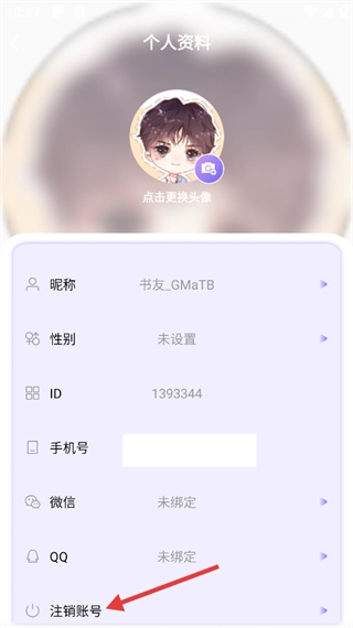 3、在耽漫神器的【个人资料】页面,找到并点击【注销账号】选项,即可进入对应的操作页面。