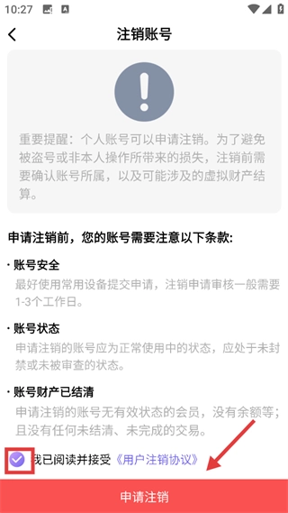 4、勾选【我已阅读并接受-用户注销协议】,接着点击【申请注销】,即可完成耽漫神器的注销操作。