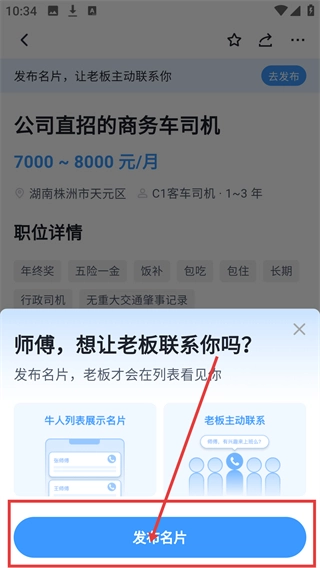 3、点击【免费拨打】后,会弹出发布名片的提示框,点击【发布名片】能让招聘方更方便地获取你的信息哦。
