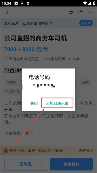 4、拨打电话后弹出电话号码界面,点击【添加到通讯录】按钮,就能把招聘方的号码保存到手机通讯录里了。