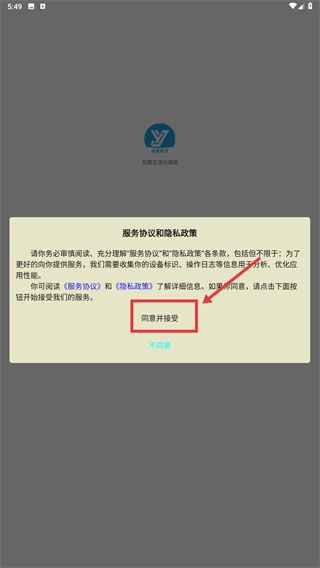 首次打开应用时,点击【同意并接受】按钮以确认服务协议与隐私政策,随后即可进入后续操作流程。