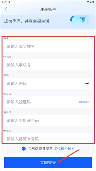 3、进入注册页面后,按顺序填写姓名、手机号码、密码、验证码、身份证号、结算卡等相关信息,勾选对应的协议条款,最后点击【立即提交】按钮,即可完成注册流程。
