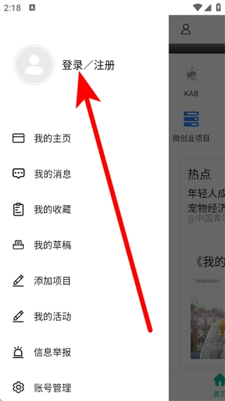 2、在侧边栏,点击登录注册,进入注册登录界面。