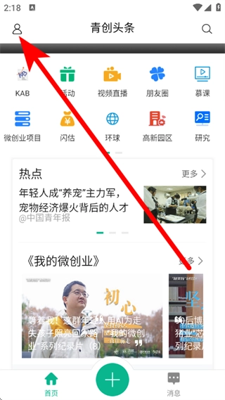 1、打开青创头条应用,在主界面找到左上角的头像图标并点击,即可展开侧边栏。