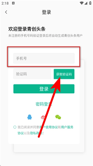 3、在注册登录页面,输入手机号,点击获取验证码。