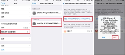 5、苹果手机特别提示:若页面弹出“未受信任的企业级开发者”提示,可依次打开手机设置→通用→描述文件与设备管理→企业级应用,找到“UNICOM......”并点击“信任”按钮,最后确认[信任]即可。