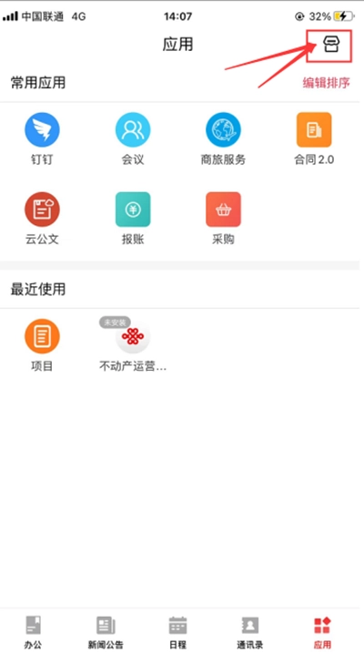 4、 打开“应用”页面,点击右上角的应用图标,进入应用商店后,在搜索框中输入“不动产运营”并执行搜索操作。