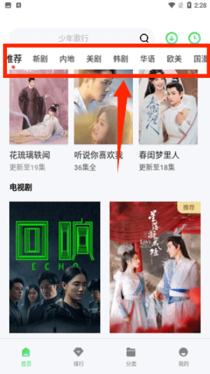 2、通过顶部推荐、新剧等分类标签切换不同版块资源。