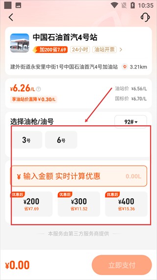3、先选择油枪(如3号/6号)与油号,再输入加油金额,也可直接选择优惠后的固定金额选项。