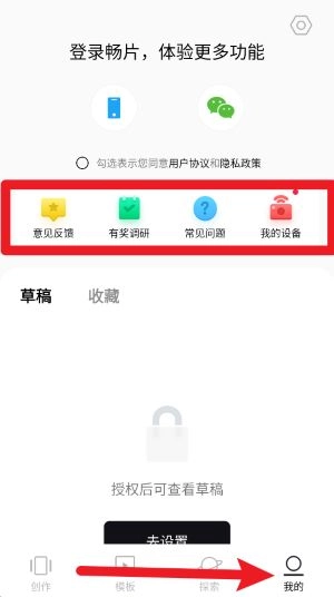 4、通过“我的”页面,您可以进行草稿管理、设备绑定、反馈意见以及参与调研等操作,方便您进行个性化的使用与设置。
