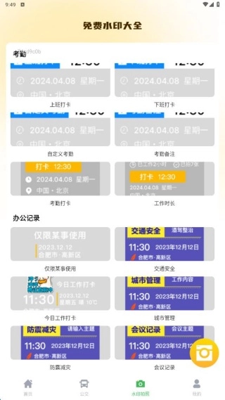 1、考勤水印免费使用:拍摄工作照片时,可免费添加考勤水印,以此证明工作的时间与地点,既方便又实用。