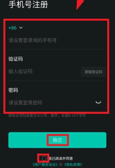 5.在手机号注册页面填写手机号、验证码与密码,勾选“我已阅读并同意《用户服务协议》和《隐私政策》”后,点击确定按钮。