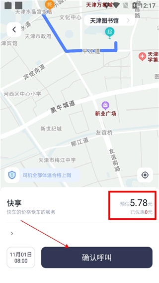 6、添加完成之后,回到上一级页面,在这里能看到本次订单的价格,点击“确认呼叫”按钮即可。