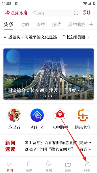 1、在软件的首页,我们可以看到头条、时政、天中、图片、天中晚报等多个板块。