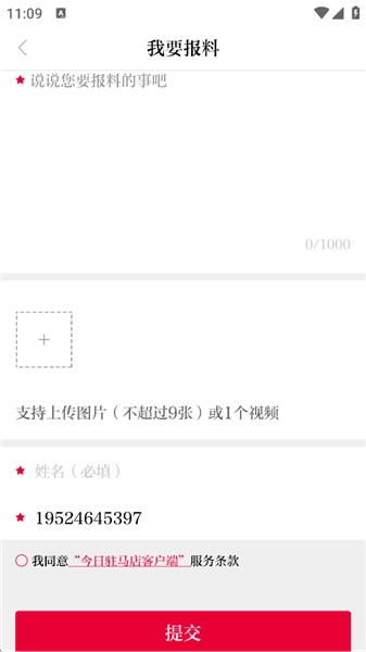 3、进入“我要报料”界面,填写报料内容、上传相关图片、输入姓名与联系电话,勾选“我同意‘今日驻马店客户端’服务条款”后,点击【提交】按钮。