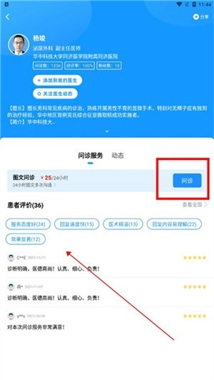 4、第四步,点击“问诊”选项,该页面同时展示有患者评价,可供大家参考。