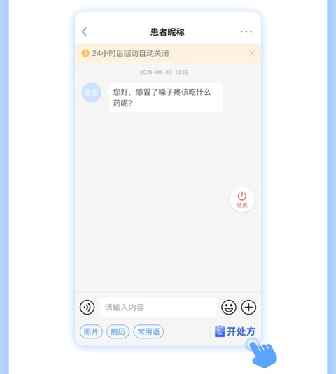 1、首先,用户在和患者聊天的页面,能够点击右下角的开处方按钮。