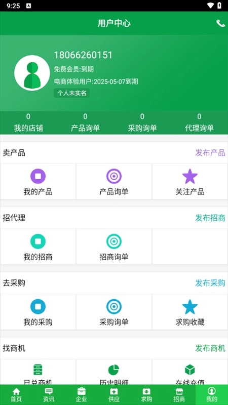 在“我的”界面中,可查看卖产品、招代理、去采购、找商机等一系列功能板块,不过这些功能需要注册登录后才能使用。