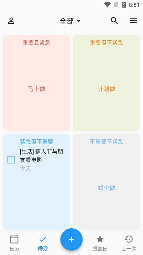 1、首先启动软件,点击界面上的加号按钮,接着依据自身的实际需求,从日常、待办、生日、纪念日等分类里进行选择,这里以“待办”类别为例进行操作说明。