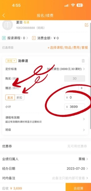 7、选择折扣,赠课,选择支付