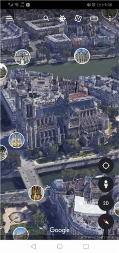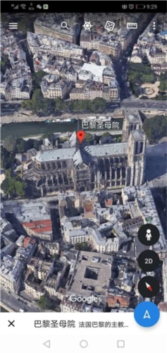 3、比如我们在搜索框里输入“巴黎圣母院”进行搜索,就能以空中鸟瞰的视角,查看巴黎圣母院的全景;