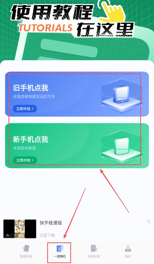 3、要是需要进行批量数据迁移,可以在软件主界面或者功能菜单里找到一键换机的页面入口,点击进入这个页面后,就能开启一键换机的相关功能了。
