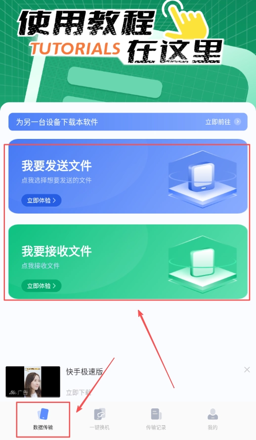 进入主界面后,找到首页的数据传输页面并点击进入,在该页面中可以看到发送和接收文件的选项,可根据实际需求选择对应的操作。