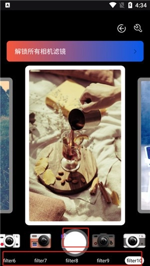 1、打开软件后,你会发现这里有大量的胶卷滤镜可供选择,只需挑选出你钟爱的那一款,再点击界面中间的拍照按钮就可以了。