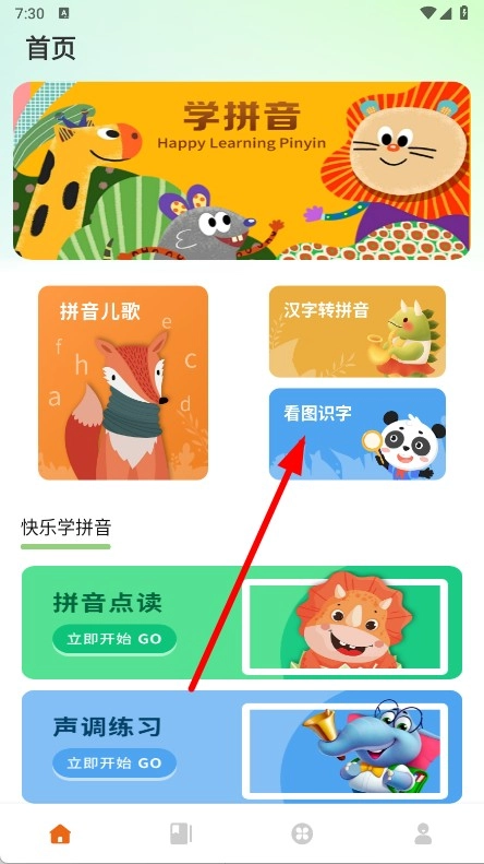 先打开全科启蒙应用,接着找到并点击看图识字板块,随后就能进入看图识字的页面了。