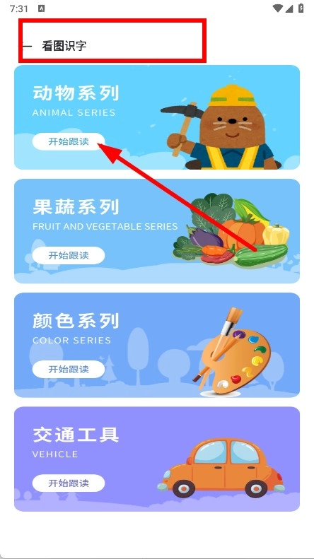 在看图识字页面,找到动物系列分类,然后点击该分类下的开始跟读按钮。
