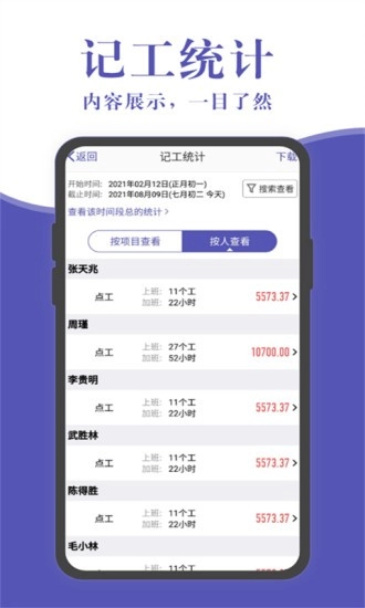 工地记工天、记工时、记加班,记工内容都很详细,点工包工都能使用。