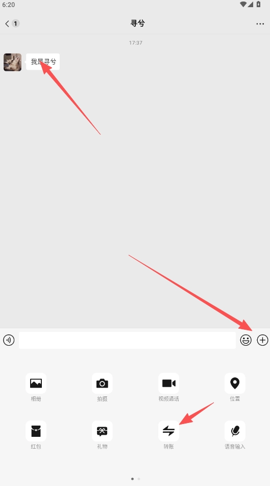 2、点击对方头像切换到发送信息状态,随后点击下方的+聊天框选择“转账”功能。