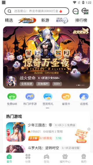 首页设有免费648、热门IP、签到有礼、省钱卡、云挂机等版块,还能浏览热门游戏资讯。