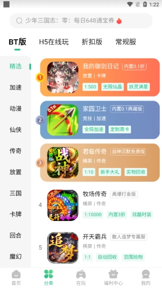 在分类有BT版、H5在线玩、拍扣版以及常规服等不同的版块,还有多种不同的细类别;