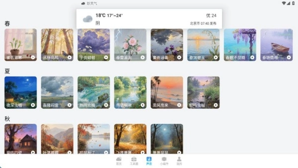 4、声音页面汇集了具有春夏秋冬等不同季节属性的白噪音素材。