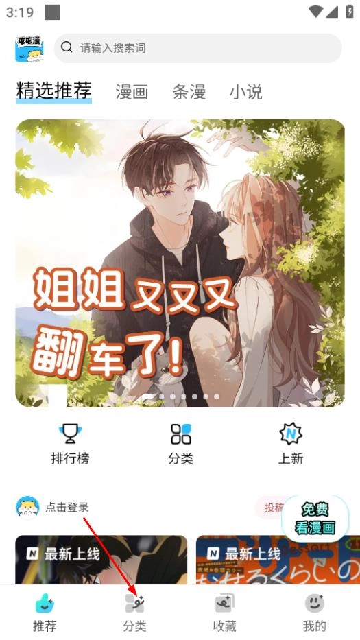 打开屯屯漫画后,找到页面底部的分类选项并点击,即可进入分类页面。