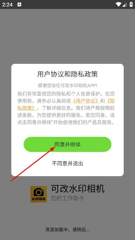 在用户协议与隐私政策的弹窗界面,点击“同意并继续”按钮,即可进入软件。