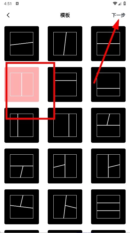 选择一个喜欢的拼图模板,点击右上角的下一步。