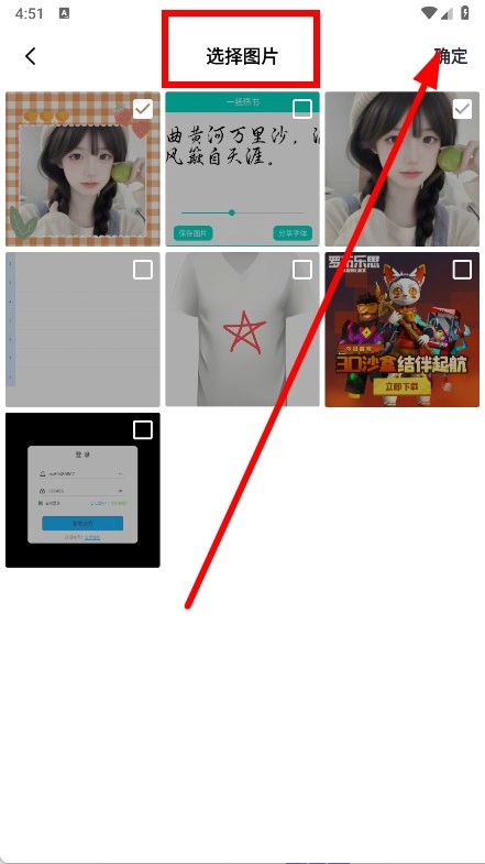 进入选择图片界面,勾选要拼接的图片,点击确定。