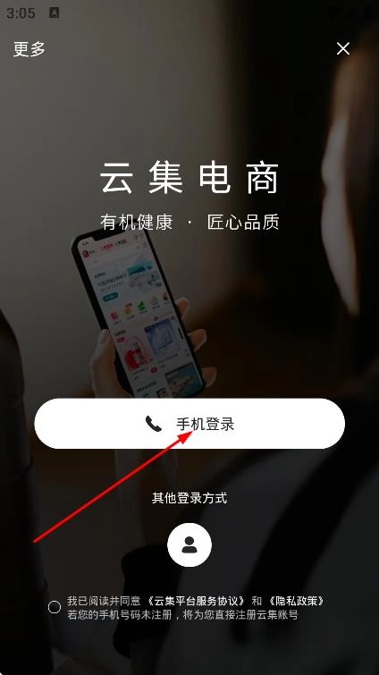 在登录选项页面,点击手机登录按钮,进入登录与注册页面。