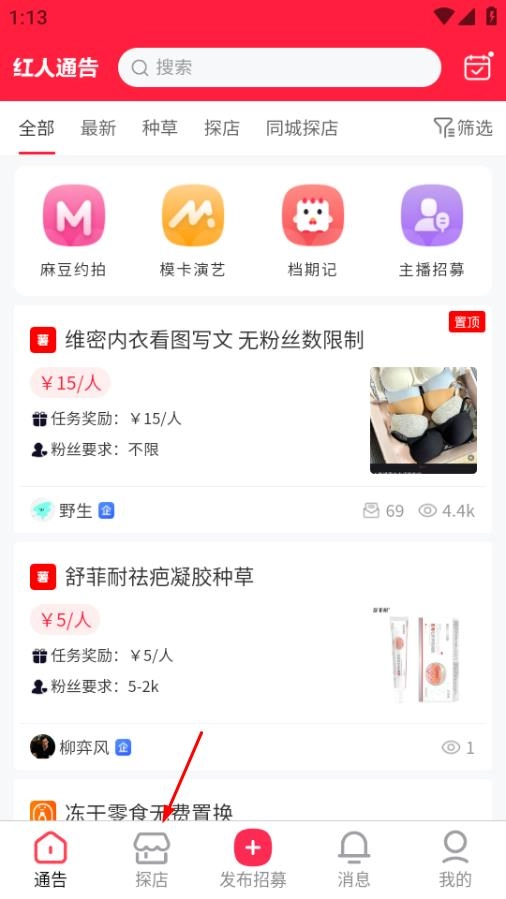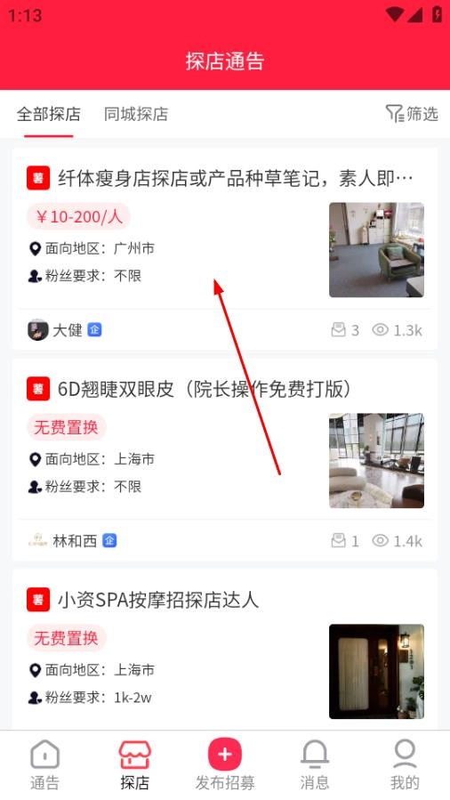 打开红人通告,点击页面底部的探店选项,即可进入探店通告页面。