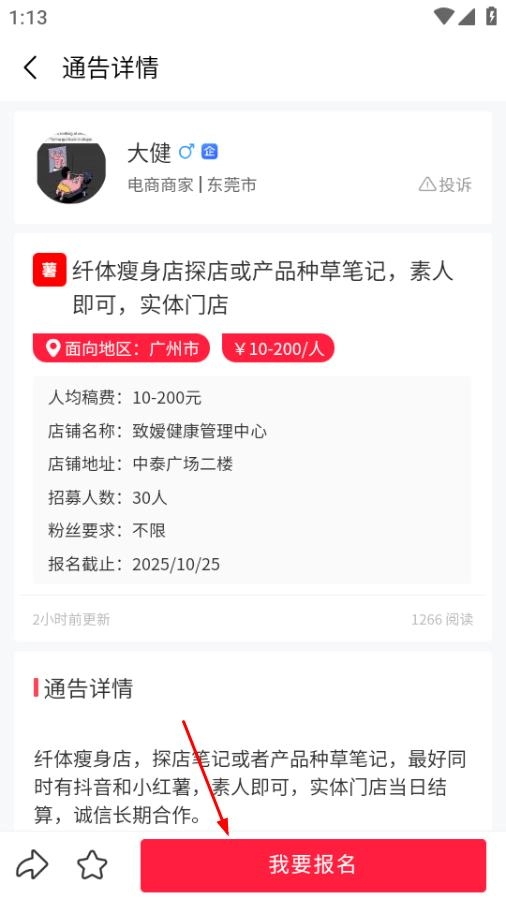 在探店通告的页面里,挑选自己感兴趣的通告,然后进入该通告的详情页面。