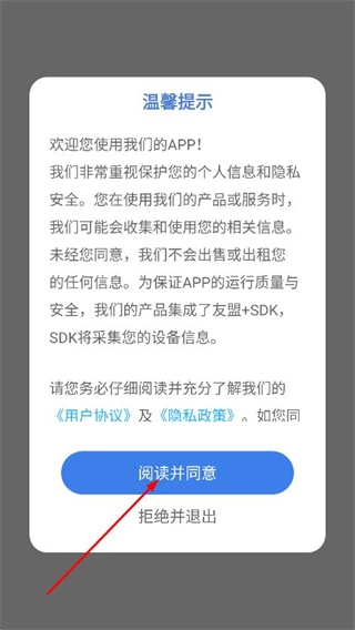 在温馨提示弹窗中,点击阅读并同意,进入主界面。