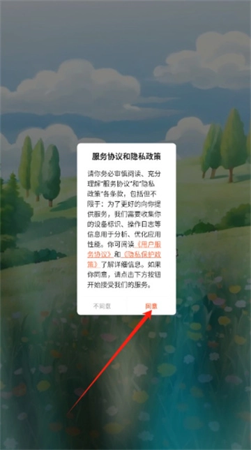 1、首次打开软件时,在服务协议和隐私政策弹窗中阅读条款后点击“同意”。